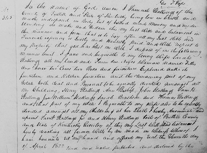In the name of God Amen. I Samuel Stallings of the county of Bullitt and state of Kentucky being low in health and much indisposed in body, but of sound mind, memory and under standing do make and ordain this my last will and testament in the manner and form, that is to say after all my just debts and funeral expenses is justly and honestly paid and with respect to my property that God has blest me with, I dispose of in the following manner to wit.