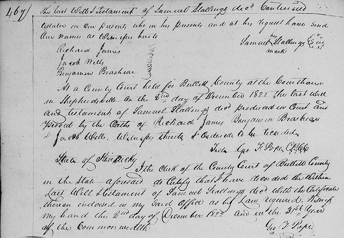 I hereby nominate and appoint Samuel Stallings Jr. and Henry Stallings, both of Bullitt County and state of Kentucky executors of this my last will and testament, hereby revoking all former wills by me made. In witness whereof I have hereunto set my hand and affixed my seal the eleventh day of April 1822. Signed and sealed, published and declared by the testator in our present who in his presents and at his request have signed our names as witnesses hereto.