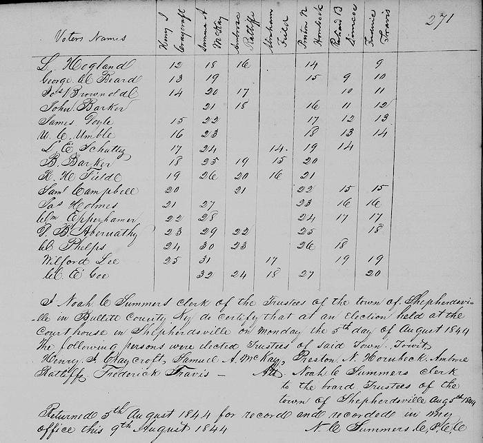 I Noah C. Summers, clerk of the trustees of the town of Shepherdsville in Bullitt County, Kentucky do certify that at an election held at the courthouse in Shepherdsville on Monday the 5th day of August 1844 the following persons were elected Trustees of said town, to-wit, Henry J. Craycroft, Samuel A. McKay, Preston N. Hornbeck, Ambrose Ratliffe, Frederick Travis. Att. Noach C. Summers, clerk of the town of Shepherdsville, August 5th 1844.