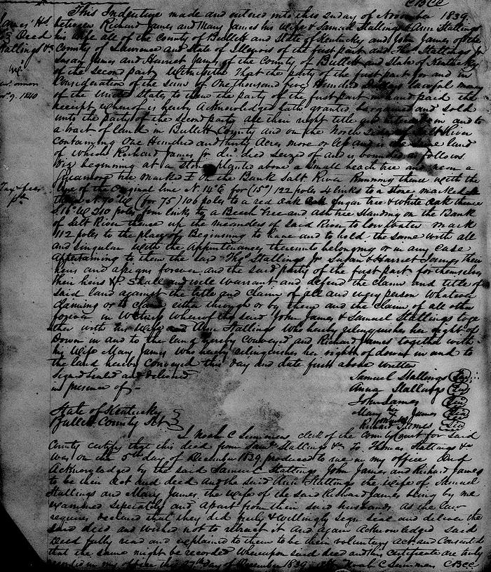 This indenture made and entered into this 2nd day of November 1839 between Richard James and Mary James his wife, and Samuel Stallings and Ann Stallings his wife all of the county of Bullitt and state of Kentucky, and John James of the county of Lawrence and state of Illinois of the first part, and Thomas Stallings Jr., Susan James and Harriet James of the county of Bullitt and state of Kentucky of the second part.