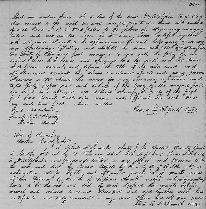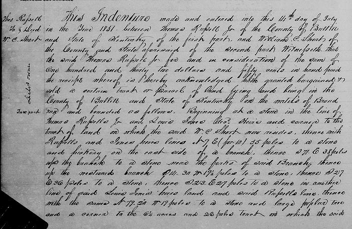 This indenture made and entered into this 14th day of July in the year 1851 between Thomas Russell Jr. of the county of Bullitt and state of Kentucky of the first part, and William C. Short of the county and state aforesaid of the second part.