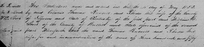 This indenture made and entered into this the fourth day of May 1853 by and between Thomas Russell and Rhoda, his wife of the county of Jefferson and state of Kentucky of the first part and William C. Short of the county of Bullitt and state aforesaid of the second part.
