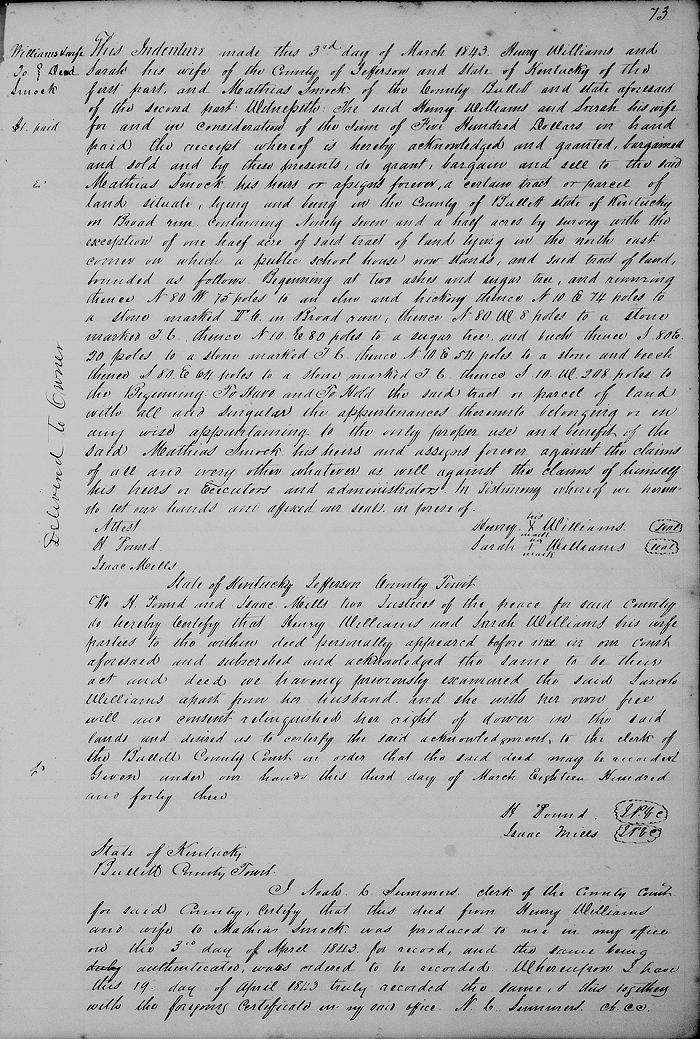 This indenture made this 3rd day of March 1843, Henry Williams and Sarah his wife of the County of Jefferson and State of Kentucky of the first part and Mathias Smock of the County of Bullitt and state aforesaid of the second part.