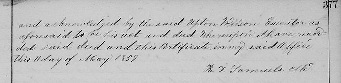 To have and to hold said lot unto the said Thomas Joyce and his heirs and assigns forever. In witness whereof I hve hereunto set my hand this 3rd day of June 1858. (signed) Upton Wilson, executor of Matthew Wilson.