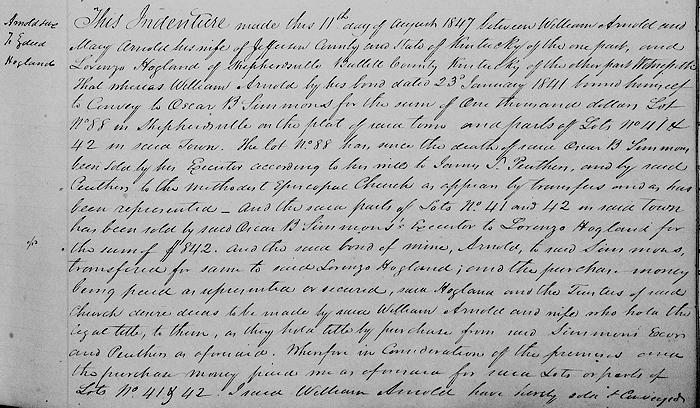 Witnesseth that whereas William Arnold by his bond dated 23rd January 1841 bound himself to convey to Oscar B Simmons for the sum of $1000 lot number 88 in Shepherdsville on the plat of said town and parts of lots Nos. 41 & 42 in said town. The lot No. 88 has since the death of said Oscar B Simmons been sold by his executor, according to his will to James S. Peuthers, and by said Peuthers to the Methodist Episcopal Church as appears by transfers and as has been represented. And the said parts of lots No. 41 & 42 in said town has been sold by said Oscar B. Simmons' executor to Lorenzo Hogland for the sum of $841, and the said bond of mine, Arnold, to said Simmons transferred for same to said Lorenzo Hogland, and the purchase money being paid or represented as secured, said Hogland and the trustees of said church desire to be made by said William Arnold and wife who hold the legal title to them, as they hold title by purchase from said Simmons' executor and Peuthers as aforesaid.