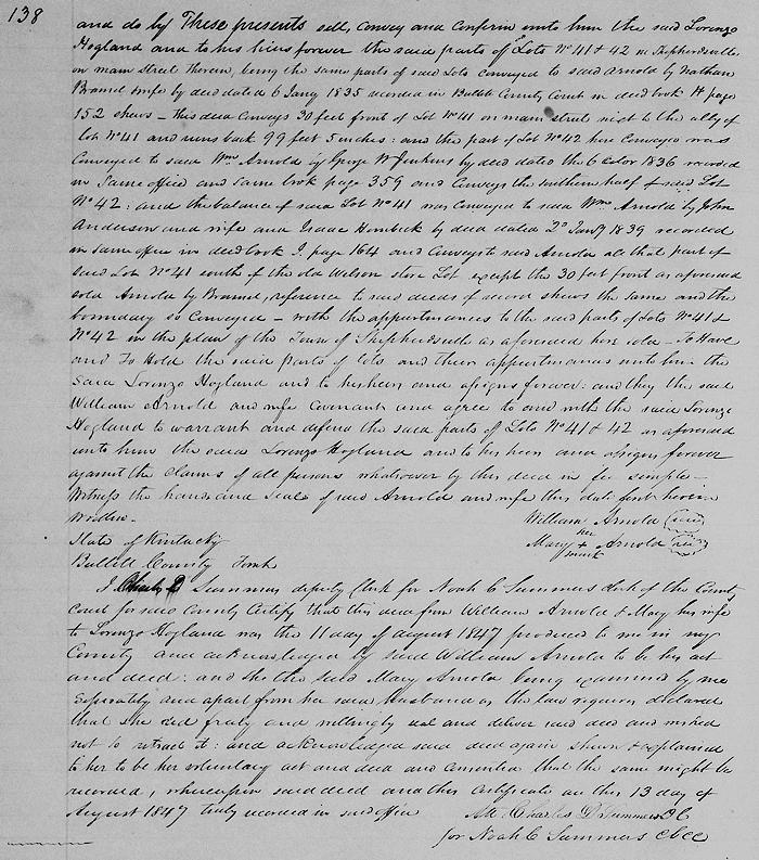 Wherefore in consideration of the premises and the purchase money paid me as aforesaid for said lots or parts of lots No. 41 & 42, I said William Arnold have hereby sold and conveyed and do by these presents sell, convey and confirm unto him the said Lorenzo Hogland and to his heirs forever the said parts of Lots No. 41 & 42 in Shepherdsville on Main Street therein, being the same parts of said lots conveyed to said Arnold by Nathan Bramel and wife by deed dated 6 January 1835, recorded in Bullitt County Court in Deed Book H, page 152 shows. This deed conveys 30 feet front of Lot No. 41 on Main Street next to the alley of Lot No. 41 and runs back 99'5"; and the part of Lot No. 42 here conveyed was conveyed to said William Arnold by George W. Jenkins by deed dated the 6 October 1836, recorded in same office and same book, page 359, and conveys the southern half of said lot No. 42; and the balance of said Lot No. 41 was conveyed to said William Arnold by John Anderson and wife and Isaac Hornbeck by deed dated 2nd January 1839, recorded in same office in Deed Book I, page 164, and conveyed to said Arnold all that part of said Lot No. 41 south of the old Wilson store lot except the 30 feed front as aforesaid sold Arnold by Brammel, reference to said deeds of record shows the same, and the boundary so conveyed, with the appurtenances to the said parts of Lots No. 41 & 42 in the plan of the town of Shepherdsville as aforesaid here sold.