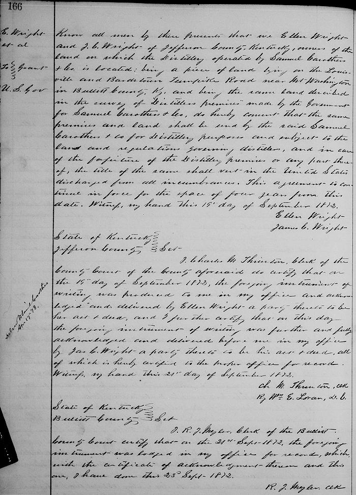 Know all men by these presents that we Ellen Wright and J. C. Wright of Jefferson County, Kentucky, owners of the land on which the distillery operated by Samuel Carrothers and company is located, being a piece of land lying on the Louisville and Bardstown Turnpike Road near Mount Washington in Bullitt County, Kentucky, and being the same land described in the survey of "Distiller's premises" made by the government for Samuel Carrothers and company, do hereby covenant that the same premises and land shall be used by the said Samuel Carrothers and company for distillery purposes, and subject to the laws and regulations governing distillers.