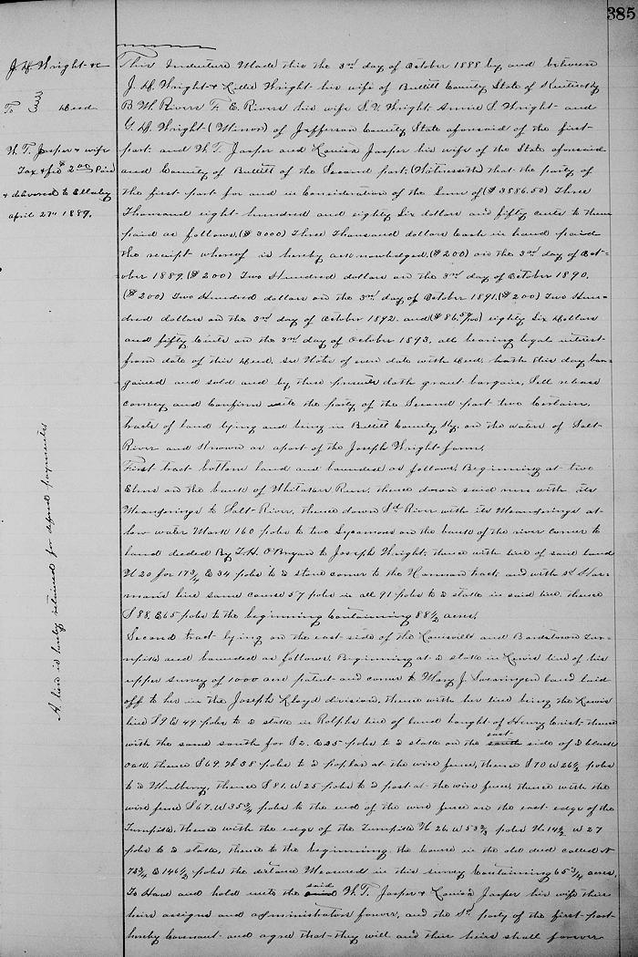 Witnesseth that the party of the first part for and in consideration of the sum of $3886.50 to them paid as follows, $3000 cash in hand paid, the receipt whereof is hereby acknowledged, $200 on the 3rd day of October 1889, $200 on the 3rd day of October 1890, $200 on the 3rd day of October 1891, $200 on the 3rd day of October 1892, and $86.50 on the 3rd day of October 1893, all bearing legal interest from date of this deed, see notes of even date with deed, hath this day bargained and sold and by these presents doth grant, bargain, sell, release, convey and confirm unto the party of the second part two certain tracts of land lying and being in Bullitt County, Kentucky on the waters of Salt River and known as part of the Joseph Wright farm.