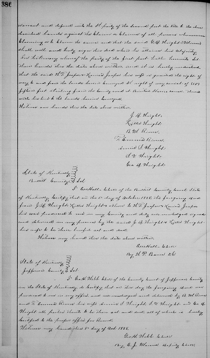 This indenture made this the 3rd day of October 1888 by and between J. D. Wright & Lille Wright his wife of Bullitt County, state of Kentucky, B. M. Rivers & F. E. Rivers his wife, S. V. Wright, Annie S. Wright and G. D. Wright (minor) of Jefferson County, state aforesaid of the first part, and W. T. Jasper and Louisa Jasper his wife of the state aforesaid and county of Bullitt of the second part.