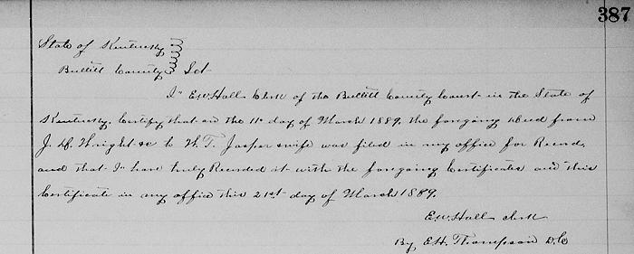 On 3 Oct 1888, James Douglas Wright, F. Emma Rivers, Sarah Virginia Wright, Annie S. Wright, and George Doup Wright, children of the deceased Joseph H. Wright, together sold two parts (totaling 154.25 acres) of his farm to W. T. Jasper, as shown below. As George was still a minor, a separate bond was given to Jasper to guarantee that George would sign the deed when he reached this 21st birthday on 14 Mar 1889, as shown further below.