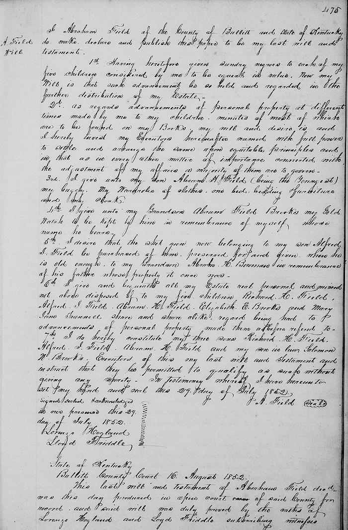 State of Kentucky, Bullitt County Court, 16 August 1852. This last will and testament of Abraham Field dec'd was this day produced in open court of said county for record, and said will was duly proved by the oaths of Lorenze Hogland and Lloyd Friddle, subscribing witnesses thereto; that the said decedent A. Field signed and acknowledged said will in their presence and said Lorenzo Hogland and Lloyd Friddle signed the same in his presence, and in the presence of each other as witnesses thereto at his request; that at the time of so executing said will decedent was in his proper senses and mind. Whereupon said will as fully proved is ordered to be recorded, which is truly done in my office. Att. R. F. Samuels, clerk.