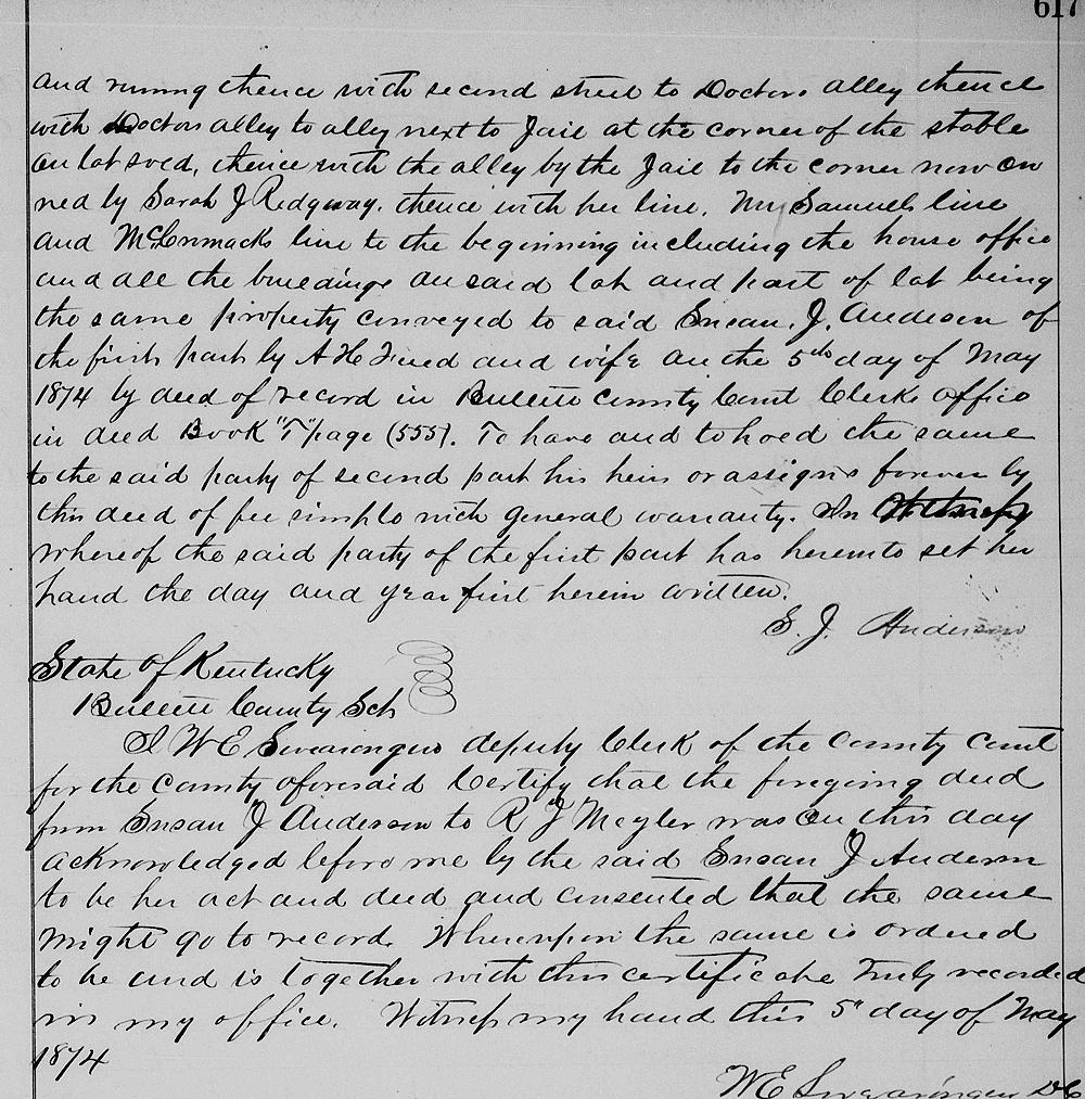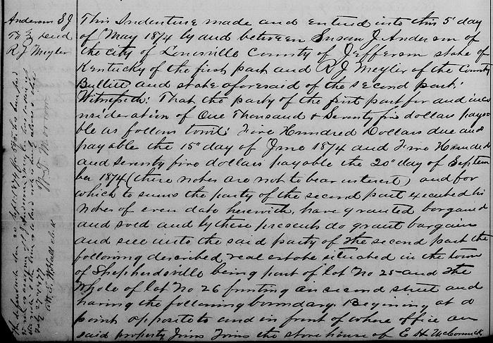 This indenture made and entered into this 5th day of May 1874 by and between Susan J. Anderson of the City of Louisville, County of Jefferson, State of Kentucky of the first part and R. J. Meyler of the County of Bullitt and State aforesaid of the second part.
