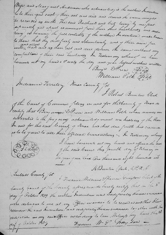 This indenture made this 31 January 1809 between Thomas Anderson and Rachael his wife, Josiah Carrico and Caty his wife, and Margaret Anderson, all of Knox County, Indiana Territory of the one part and Thomas Russell of Bullitt County and state of Kentucky of the other part.