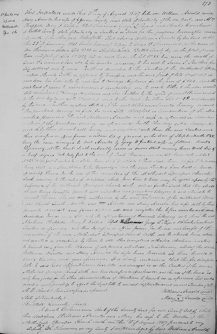 In testimony, where of the said William Arnold and Mary Arnold, his wife have here unto set their hands and seals the day and year aforesaid. It is clearly understood that the fee simple title to said a lot and appurtenances here sold and conveyed is in the trustees of the said methodist, Episcopal Church, South, and their successors in office forever, and the use of the house is only here given for the other denominations of Christians to preach in as aforesaid, but in no event is said privilege to effect the legal title to said lot and appurtenances in said trustees of said M. E. Church and their successors as aforesaid. (signed) William Arnold, Mary [her x mark] Arnold