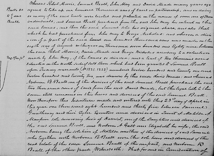 Whereas Robert Morris, Samuel Beall, John May and David Meade many years ago agreed to take up 100,000 acres of land in partnership, and in doing so many of the said tracts were located and patented in the name of some one of those individuals; and Samuel Beall purchased from the said John May his interest in the said lands, and then the said Samuel sold his original share, and also that which he had purchased from John May to George Nicholas; and whereas a division of a part of the said 100,000 acres was made on the sixth day of August in the year 1789 between the said Robert Morris, David Meade and George Nicholas according to a valuation made by John May of the lands so divided; and a tract of 2,000 acres situated on the north side of Salt River which had been granted to Samuel Beall upon Treasury Warrants No. 1221, 1222 was drawn by the said David Meade; and whereas Norborne B. Beall, one of the devisees of the said Samuel Beall purchased the said 2,000 acres of land from the said David Meade, but the legal title to the same still remains in the heirs and devisees of the said Samuel Beall.