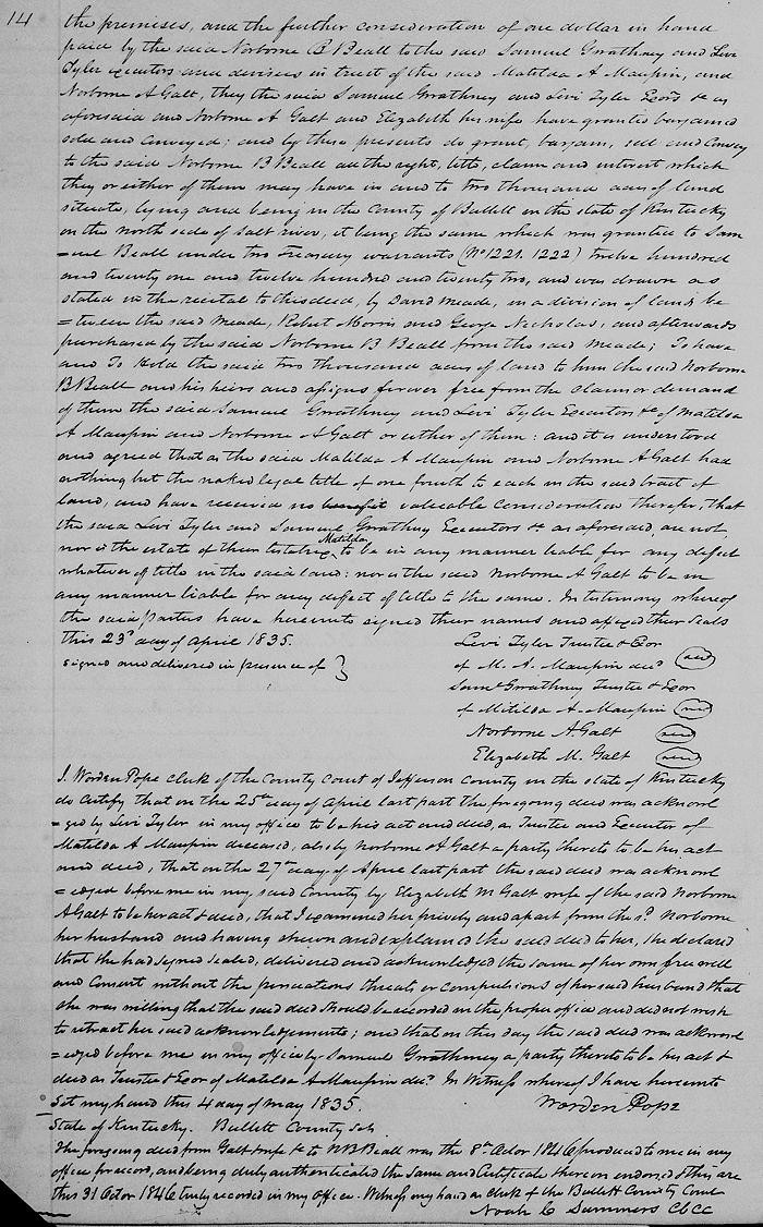 Witnesseth that for and in consideration of the premises and the further consideration of one dollar in hand paid by the said Norborne B. Beall to the said Samuel Gwathney and Levi Tyler, executors and devisees in trust of the said Matilda A. Maupin, and Norborne A. Galt, they the said Samuel Gwathney and Levi Tyler, executors &c as aforesaid and Norborne A. Galt and Elizabeth his wife have granted, bargained, sold and conveyed, and by these presents do grant, bargain, sell and convey to the said Norborne B. Beall all the right, title, claim and interest which they or either of them may have in and to 2,000 acres of land situate, lying and being in the county of Bullitt in the state of Kentucky on the north side of Salt River, it being the same which was granted to Samuel Beall under two Treasury Warrants No. 1221, 1222, and was drawn as stated in the recital to this deed by David Meade in a division of land between the said Meade, Robert Morris and George Nicholas, and afterwards purchased by the said Norborne B. Beall from the said Meade; to have and to hold the said 2,000 acres of land to him the said Norborne B. Beall and his heirs and assigns forever free from the claim or demand of them the said Samuel Gwathney and Levi Tyler, executor &c of Matilda A. Maupin and Norborne A. Galt or either of them. And it is understood and agreed that as the said Matilda A. Maupin and Norborne A. Galt had nothing but the naked legal title of one-fourth to each in the said tract of land, and have received no valuable consideration therefore, that the said Levi Tyler and Samuel Gwathney, executors &c as aforesaid, are not nor is the estate of their testatrix Matilda to be in any manner liable for any defect whatever of title in the said land; nor is the said Norborne A. Galt to be in any manner liable for any defect of title to the same. In testimony whereof the said parties have hereunto signed their names and affixed their seals this 23rd day of April 1835.