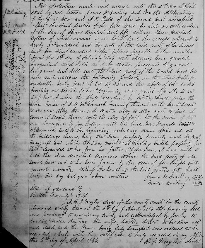 Witnesseth that the said parties of the first part, for and in consideration of the sum of $750, $300 of which amount is in hand paid, the receipt whereof is hereby acknowledged, and the note of the said party of the second part, for $450 payable 12 months from the 7th day of February 1866 with interest, have granted, bargained and sold and by these presents do grant, bargain and sell unto the said party of the second part, his heirs and assigns the following property in the town of Shepherdsville being part of lot No. 25 and the whole of lot No. 26 fronting on Second Street.