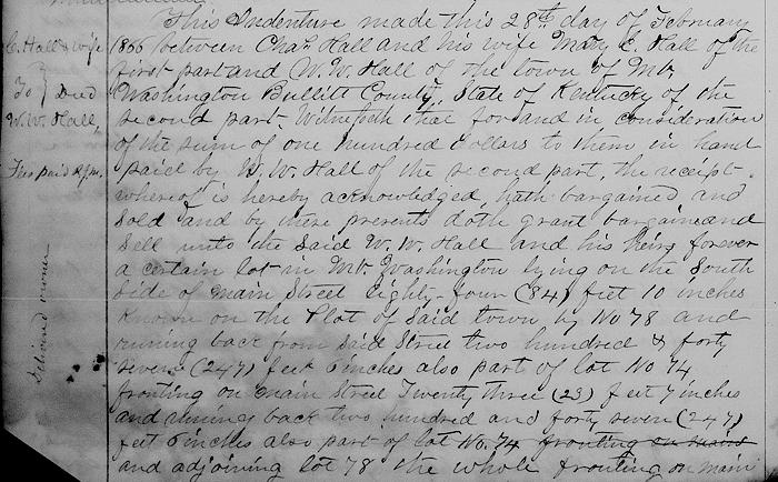 Witnesseth that for and in consideration of the sum of $100 to them in hand paid by W. W. Hall of the second part, the receipt whereof is hereby acknowledged, hath bargained and sold and by these presents doth grant, bargain and sell unto the said W. W. Hall and his heirs forever a certain lot in Mt. Washington lying on the south side of Main Street 84'10" known on the plot of said town by No. 78 and running back from said street 247'6"; also part of lot No. 74 fronting on Main and adjoining lot 78, the whole fronting on Main Street 108'5" and being the same property conveyed by Austin Hough and wife to Jacob N. Boswell by deed bearing date the 17th of January 1855 and recorded in the Bullitt County clerk's office.