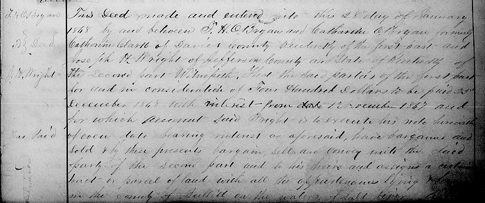 This deed made and entered into this 28th day of January 1868 by and between T. H. O'Bryan and Catharine O'Bryan, formerly Catharine Clark of Daviess County, Kentucky of the first part, and Joseph H. Wright of Jefferson County and state of Kentucky of the second part.