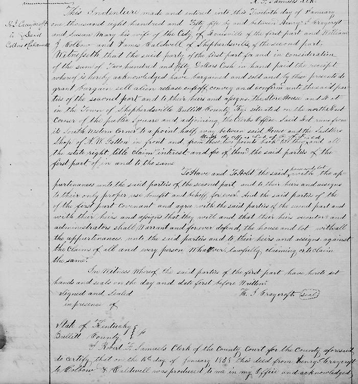 Henry J. Craycroft had given a bond for "a house and other buildings on lots or parts of lots Nos. 25 & 26 in the new plan of its town of Shepherdsville" to Francis Maraman who had assigned it to Colbow and Caldwell. We located another deed (shown below) in which Craycroft deeded the tract to Colbow and Caldwell. By another deed they assigned it to Martha A. Maraman in exchange for about 76 acres of land south of Salt River.