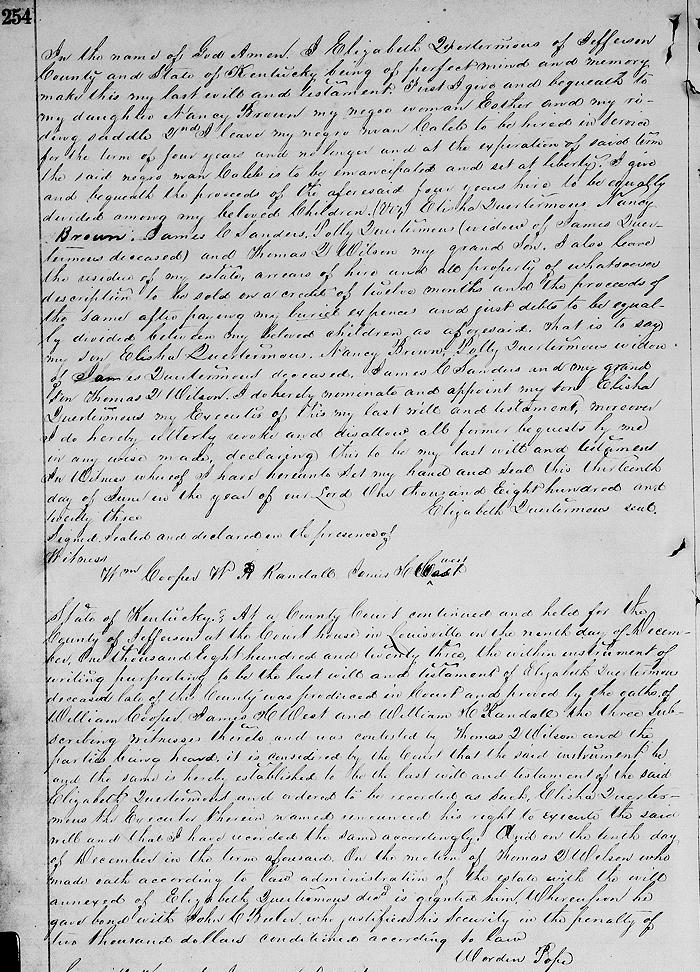 At a County Court continued and held for the County of Jefferson at the Court house in Louisville the ninth day of December, One thousand Eight hundred and twenty three, the within instrument of writing purporting to be the last will and testament of Elizabeth Quertermous deceased, late of this County was produced in Court and proved by the oaths of William Cooper James H West and William H Randall, the three Subscribing witnesses thereto and was contested by Thomas Q Wilson and the parties being heard, it is considered by the Court that the said instrument be and the same is hereby established to be the last will and testament of the said Elizabeth Quertermous and ordered to be recorded as such.