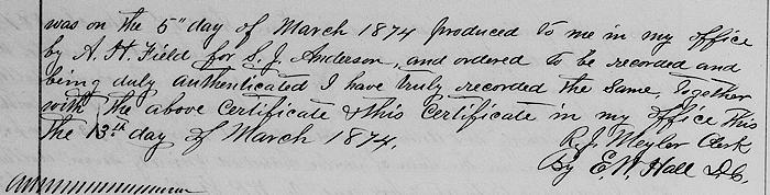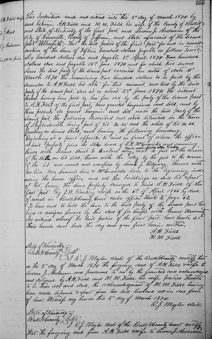This indenture made and entered into this 5th day of March 1874 by and between A. H. Field and M. M. Field his wife of the County of Bullitt and State of Kentucky of the first part, and Susan J. Anderson of the City of Louisville, County of Jefferson, and State aforesaid of the second part.