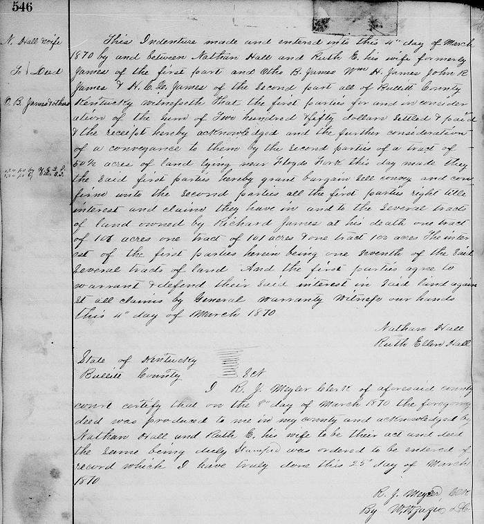 Witnesseth that the first parties for and in consideration of the sum of $250 settled and paid and the receipt hereby acknowledged, and the further consideration of a conveyance to them by the second parties of a tract of 50 1/2 acres of land lying near Floyd's Fork this day made, they the said first part hereby grant, bargain, sell, convey and confirm unto the second parties all the first party's right, title, interest, and claim they have in and to the several tracts of land owned by Richard James at his death, one tract of 106 acres, one tract of 101 acres, and one tract of 100 acres; the interest of the first parties here in be one-seventh of the said several tracts of land. And the first parties agreed to warrant and defend their said interest and said land against all claims by general warranty. Witness our hands this fourth day of March 1870. (signed) Nathan Hall, Ruth Ellen Hall