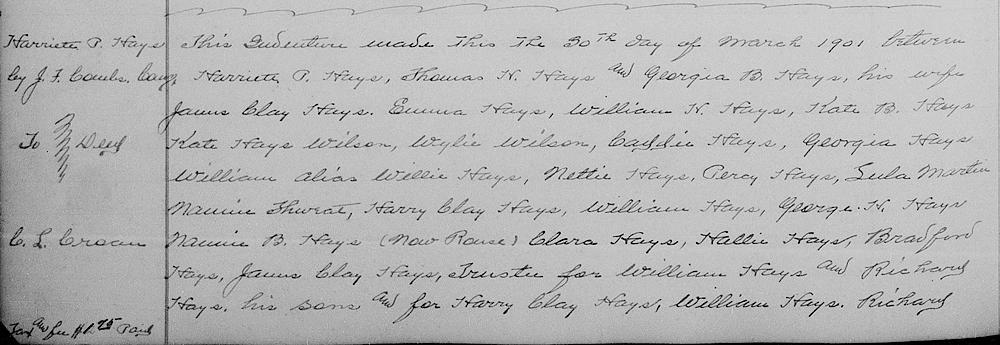 This indenture made this the 30th day of March 19 1901 between Harriet P. Hays, Thomas H. Hays and Georgia B. Hays his wife, James Clay Hays, Emma Hays, William H. Hays, Kate B Hays, Kate Hays Wilson, Wylie Wilson, Caddie Hays, Georgia Hays, William alias Willie Hays, Nettie Hays, Percy Hays, Lula Martin, Nannie Thweat, Henry Clay Hays, William Hays, George H. Hays, Nannie B. Hays (now Rouse), Clara Hays, Halle Hays, Bradford Hays, James Clay Hays, trustee for William Hays and Richard Hays, his sons, and for Harry Clay Hays, William Hays, Richard Hays, the Louisville Trust Company as assignee of Ben Chapeze, the Louisville Trust Company as assignee of Richard Wathen and W. G. Hays, executor of W. H. Hays, deceased, and the Louisville Trust Company by J. F. Combs, Master Commissioner of the Bullitt Circuit Court of the one part and C. L. Croan of the other part.