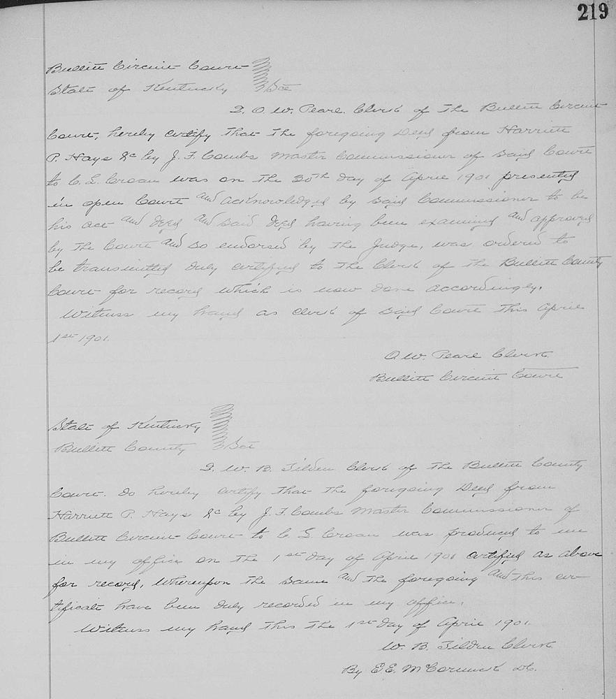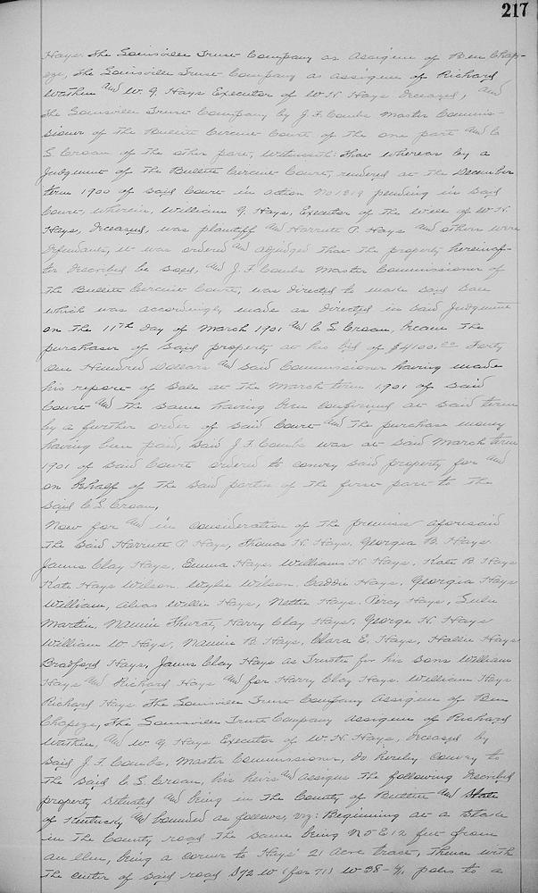 Now for and in consideration of the premises aforesaid the said Harriet P. Hays, Thomas H. Hays, Georgia B. Hays, James Clay Hays, Emma Hays, William H. Hays, Kate B Hays, Kate Hays Wilson, Wylie Wilson, Caddie Hays, Georgia Hays, William alias Willie Hays, Nettie Hays, Percy Hays, Lula Martin, Nannie Thweat, Henry Clay Hays, George H. Hays, William W. Hays, Nannie B. Hays, Clara E. Hays, Halle Hays, Bradford Hays, James Clay Hays as trustee for his sons William Hays and Richard Hays, and for Harry Clay Hays, William Hays, Richard Hays, the Louisville Trust Company, assignee of Ben Chapeze, the Louisville Trust Company as assignee of Richard Wathen and W. G. Hays, executor of W. H. Hays, deceased by said J. F. Combs, Master Commissioner do hereby convey to the said C. L. Croan, his heirs and assigns the following described property situated and being in the County of Bullitt and State of Kentucky and bounded as follows, viz.