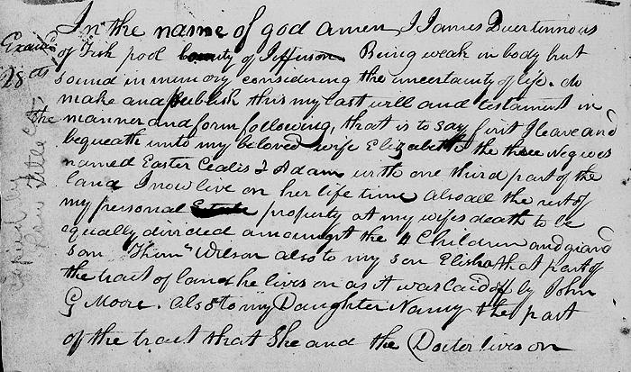 In the name of God Amen. I James Quertermous of Fishpool, County of Jefferson, being weak in body but sound in memory, considering the uncertainty of life, do make and publish this my last will and testament in manner and form following; that is to say, first I leave and bequeath unto my beloved wife Elizabeth the three negroes named Easter, Ceatis and Adam with the one-third part of the land I now live on her lifetime; also all the rest of my personal property; at my wife's death to be equally divided amongst the 4 children and grandson, Thomas Wilson.