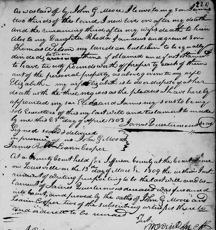 At a county court for Jefferson County at the courthouse in Louisville on the 13th day of March 1809, the within judgment of writing purporting to be the last will and testament of James Quertermous, deceased, was produced into court and proved by the oaths of John G. Moore and Learrn Cooper, two of the subscribing witnesses thereto and ordered to be recorded. Att. Worden Pope, clerk