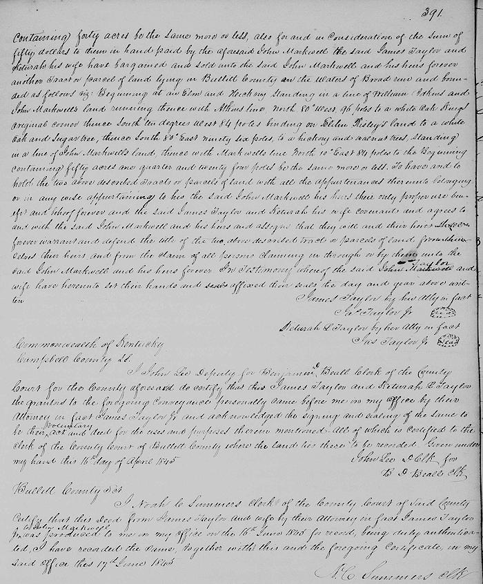 Also for and in consideration of the sum of $50 to them in hand paid by the aforesaid John Markwell the said James Taylor and Katurah his wife have bargained and sold unto the said John Markwell and his heirs forever another tract or parcel of land lying in Bullitt County on the waters of Broad Run and bounded as follows viz.