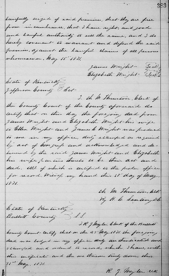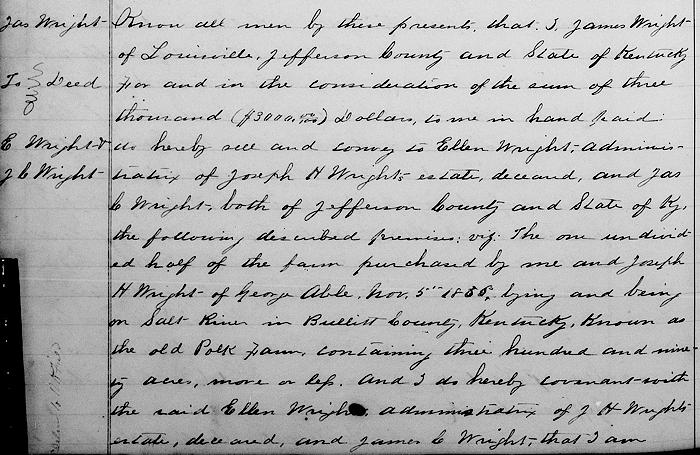 Know all men by these presents that I James Wright of Louisville, Jefferson County and state of Kentucky for and in the consideration of the sum of $3000 to me in hand paid do hereby sell and convey to Ellen Wright, administratrix of Joseph H. Wright's estate, deceased, and James C. Wright, both of Jefferson County and state of Kentucky the following premises, viz: the one undivided half of the farm purchased by me and Joseph H. Wright of George Able November 5, 1855 lying and being on Salt River in Bullitt County, Kentucky, known as the old Polk farm containing 350 acres more or less.