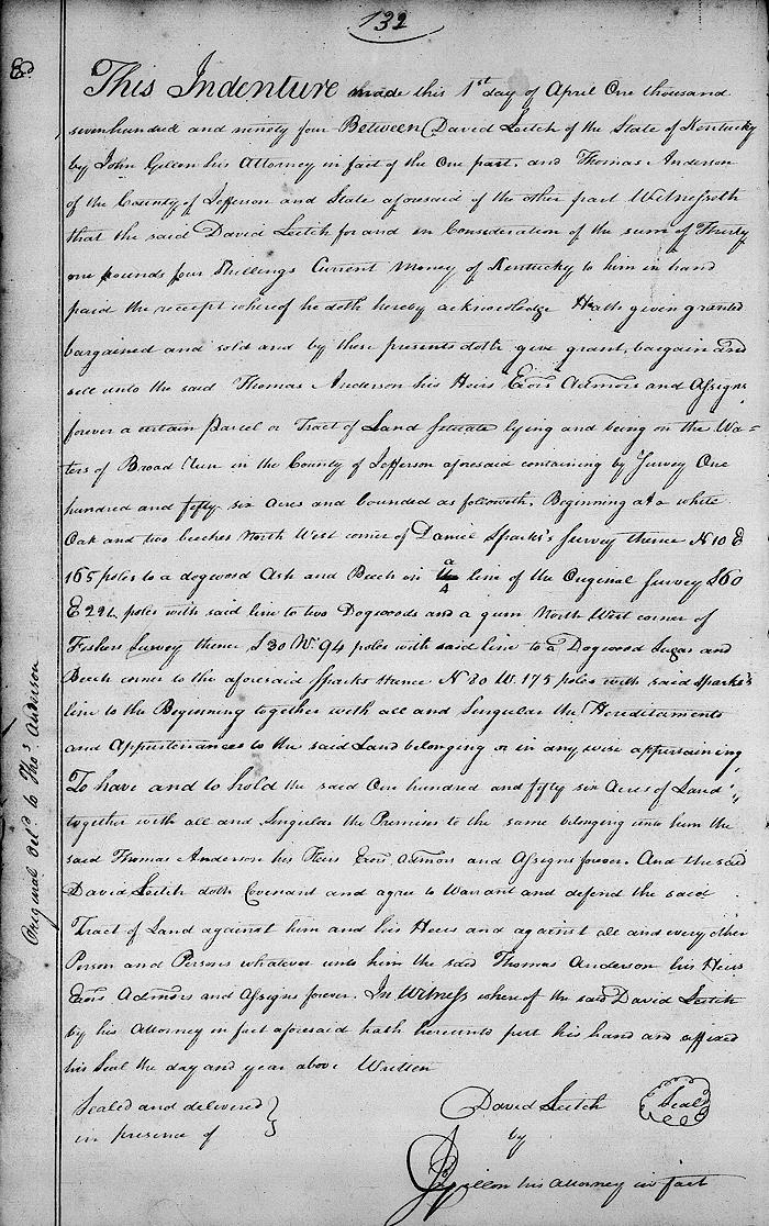 Witnesseth that the said David Leitch for and inconsideration of the sum of 31 pounds, 4 shillings current money of Kentucky to him in hand paid, the receipt whereof he doth hereby acknowledge, hath given, granted, bargained and sold, and by these presents doth give, grant bargain and sell unto the said Thomas Anderson, his heirs, executors, administrators and assigns forever a certain parcel or tract of land situate lying and being on the waters of Broad Run in the county of Jefferson aforesaid containing by survey 156 acres and bounded as followeth.