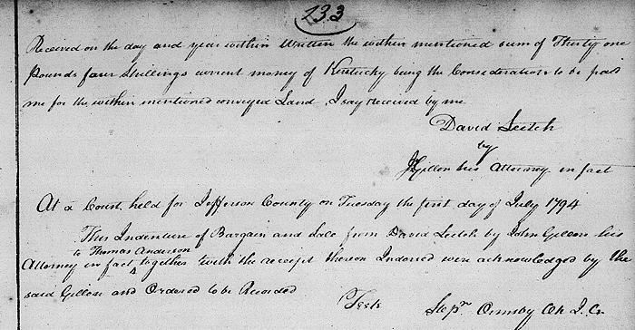 This indenture made this 1st day of April 1794 between David Leitch of the state of Kentucky by John Gillen his attorney in fact of the one part and Thomas Anderson of the county of Jefferson and state aforesaid of the other part.