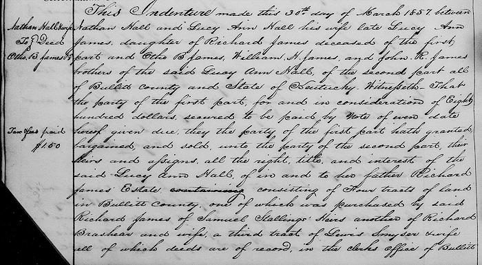 This indenture made the 30th day of March 1857 between Nathan Hall and Lucy Anne Hall, his wife, late Lucy Ann James, daughter of Richard James dec'd of the first part and Otho B. James, William H. James and John R. James, brothers of the said Lucy Ann Hall of the second part, all of Bullitt County and state of Kentucky.