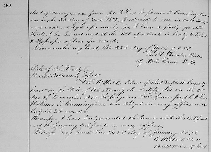 This deed of conveyance made and entered into the 22nd day of December 1877 between Joseph F. Lux of the city of Louisville, state of Kentucky, party of the first part, and James T. Cunningham of the county of Bullitt, state of Kentucky, party of the second part.