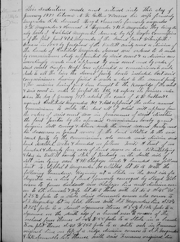 Witnesseth whereas in 1859 by judgment of the Bullitt County Court, a division of the lands of Archibald Magruder dec'd was ordered to be made by commissioners duly appointed by said court, and a division was accordingly made, and approved by said court, and by order of said court Casper Herps was appointed a commissioner to make deeds to all the heirs, the second party hereto included. But said commissioner, having failed to make a deed to the second party, and this omission, having just been brought to the knowledge of the court, and said court in order to perfect the title and to enforce its former order did on the __ day of January 1873 redocket the cause of N. W. Gatton &c against Archibald Magruder's heirs, and did appoint the above named commissioners to make this deed, all of which will appear from the orders of said court. Now in pursuance of said direction, the first parties by the aforesaid commissioner hereby grant, bargain, sell, convey and deliver unto the said second party and his successors or present owners of the land allotted to the said second party by the commissioners who made said division, said land described, metes and bounded as follows, to-wit.