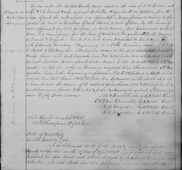 Now pursuant to said decree I as commissioner for the heirs of Archibald Magruder dec'd convey to Samuel F. Magruder lot No. 3 as laid down and reported by said commissioner with following boundary. Beginning at a stake division corner to lot No. 4 allotted to E. E. Magruder, also division corner to lot No. 2 allotted to Samuels and wife, thence with said Samuels' line S 4 1/2° E 240 poles to a white oak, said Samuels' division corner, also division corner to lot No. 4 allotted to E. E. Magruder on top of a ridge in Froman's original line, thence with E. E. Magruder's line to the beginning aas follows: N 40° E 152 poles to a stake in a branch (Bon plat), thence N 14 3/4° E 55 poles to a sycamore on the south edge of a branch near the corner of the orchard fence, thence N 83 3/4° W 90 1/2 poles to a small sycamore, thence N 82 3/4° W 2 3/4 poles containing by report of commissioner eighty-seven acres.