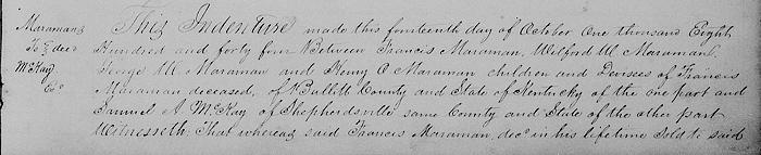 This indenture made this 14th day of October 1844 between Francis Maraman, Wilford W. Maraman, George W. Maraman and Henry O. Maraman, children and devisees of Francis Maraman dec'd of Bullitt County and state of Kentucky of the one part and Samuel A. McKay of Shepherdsville, same county and state, of the other part.