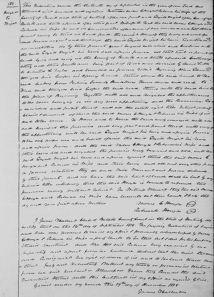 This indenture made this 13th day of September in the year of our Lord 1818 between Moses C. Hough and Rebecca his wife of the County of Bullitt and State of Kentucky of the one part, and Elijah Wright of the County of Bullitt and State aforesaid of the other part.