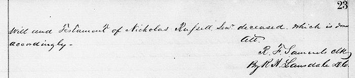 The foregoing will of Nicholas Russell, deceased, as authenticated, was on this day the 21st July 1856 produced in court, and being authenticated, is ordered to be recorded as the last will and testament of Nicholas Russell Sr., deceased, which is done accordingly.