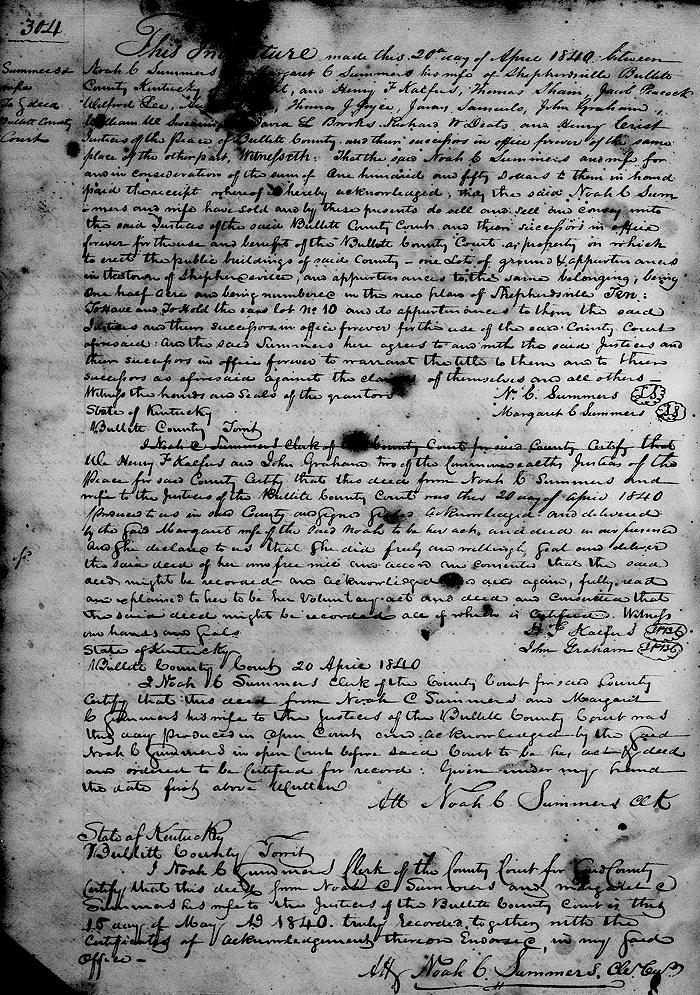 Witnesseth that the said Noah C. Summers and wife for and in consideration of the sum of $150 to them in hand paid, the receipt whereof is hereby acknowledged, they the said Noah C. Summers and wife have sold and by these presents do sell and convey unto the said Justices of the said Bullitt County Court and their successors in office forever for the use and benefit of the Bullitt County Court as property on which to erect the public buildings of said county - one lot of ground and appurtenances in the town of Shepherdsville, and appurtenances to the same belonging, being one-half acre and being numbered in the new plan of Shepherdsville, ten.
