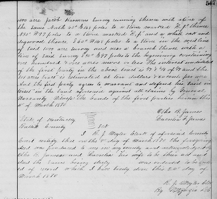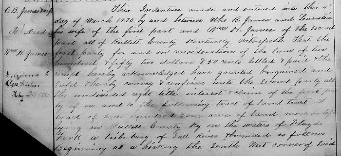 This indenture made and entered into this fourth day of March 1870 by and between Otho B. James and Lucretia his wife of the first part and William H. James of the second part, all of Bullitt County, Kentucky.