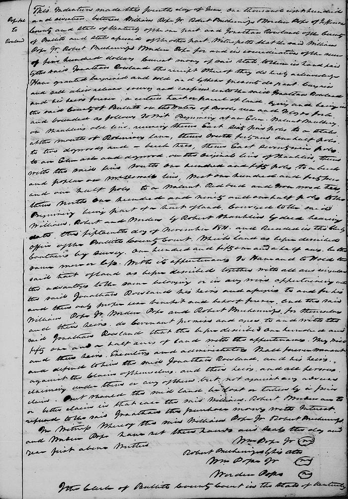 This indenture made this fourth day of June 1817 between William Pope Jr., Robert Breckenridge and Worden Pope of Jefferson County and State of Kentucky of the one part and Jonathan Rowland of the county of Bullitt and state aforesaid of the other part.