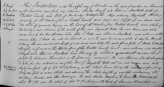 Witnesseth that whereas Elizabeth Hall, formerly of Mt. Washington in Bullitt County died seized and possessed of one house and two lots of ground laying in the town of Mt. Washington, Bullitt County and state of Kentucky; and whereas by the death of the said Elizabeth Hall the said house and lots descended to her two children, to-wit, John S. Hall and Rebecca Newkirk; and whereas the said John S. Hall has sold his interest in and to said house and lots to Austin Hough, it being the one undivided half of said house and lots, the deed from John S. Hall to Austin Hough is of record in the clerk's office of the Bullitt County Court; and whereas said Austin Hough and Rebecca Newkirk have this day by mutual agreement divided the said property between themselves in the following manner: the said Rebecca Newkirk agrees to take for her interest as one of the heirs of Elizabeth Hall dec'd in said house and lots 61 feet off of lot No. 74 binding on the school house lot on the west and fronting 61 feet on Main Street and extending the whole length of said lot including the dwelling house and other buildings; the said Austin Hough is to have the balance of Lot No. 74 and the whole of Lot No. 78 which joins the lands of Samuel Davison.