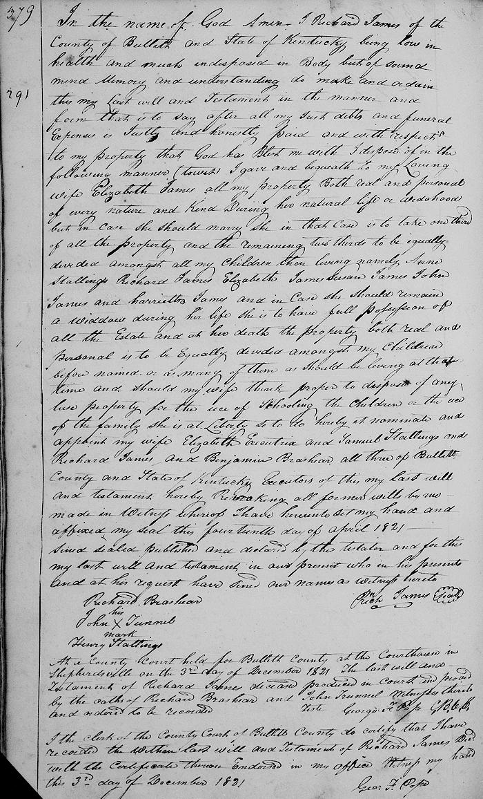 In the name of God Amen. I Richard James of the county of Bullitt and state of Kentucky, being low in health and much indisposed in body but of sound mind, memory and understanding, do make and ordain this my last will and testament in the manner and form, that is to say after all my just debts and funeral expenses is justly and honestly paid, and with respect to my property that God has blest me with, I dispose of in the following manner (to wit).
