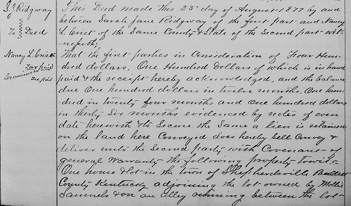 This deed made this 23rd day of August 1877 by and between Sarah Jane Ridgway of the first part and Nancy L. Crist of the same county and state of the second part.