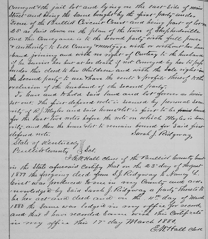 To have and to hold said land and lot forever as herein set out. The first deferred note is secured by personal security of R. J. Meyler, and said house and lot is first to be bound for the last two notes before the note on which Meyler is security, and then the house and lot to remain bound for said first deferred note. (signed) Sarah J. Ridgway.