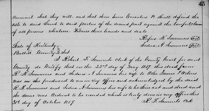 This indenture made this first day of March in the year 1857 between Rufus K. Summers and Sedna Ann his wife of the first part and Otho B. James, William H. James and John R. James the second part all of the county of Bullitt, state of Kentucky.